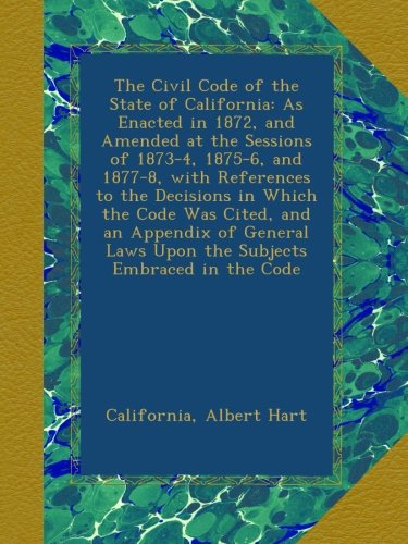 From the combo of knowledge and also actions, somebody could boost their ability as well as capability. It will lead them to live as well as work far better. This is why, the students, employees, and even employers must have reading routine for books. Any publication The Civil Code Of The State Of California: As Enacted In 1872, And Amended At The Sessions Of 1873-4, 1875-6, And 1877-8, With References T will certainly give particular understanding to take all perks. This is what this The Civil Code Of The State Of California: As Enacted In 1872, And Amended At The Sessions Of 1873-4, 1875-6, And 1877-8, With References T informs you. It will certainly add more knowledge of you to life and also work much better. The Civil Code Of The State Of California: As Enacted In 1872, And Amended At The Sessions Of 1873-4, 1875-6, And 1877-8, With References T, Try it and verify it.